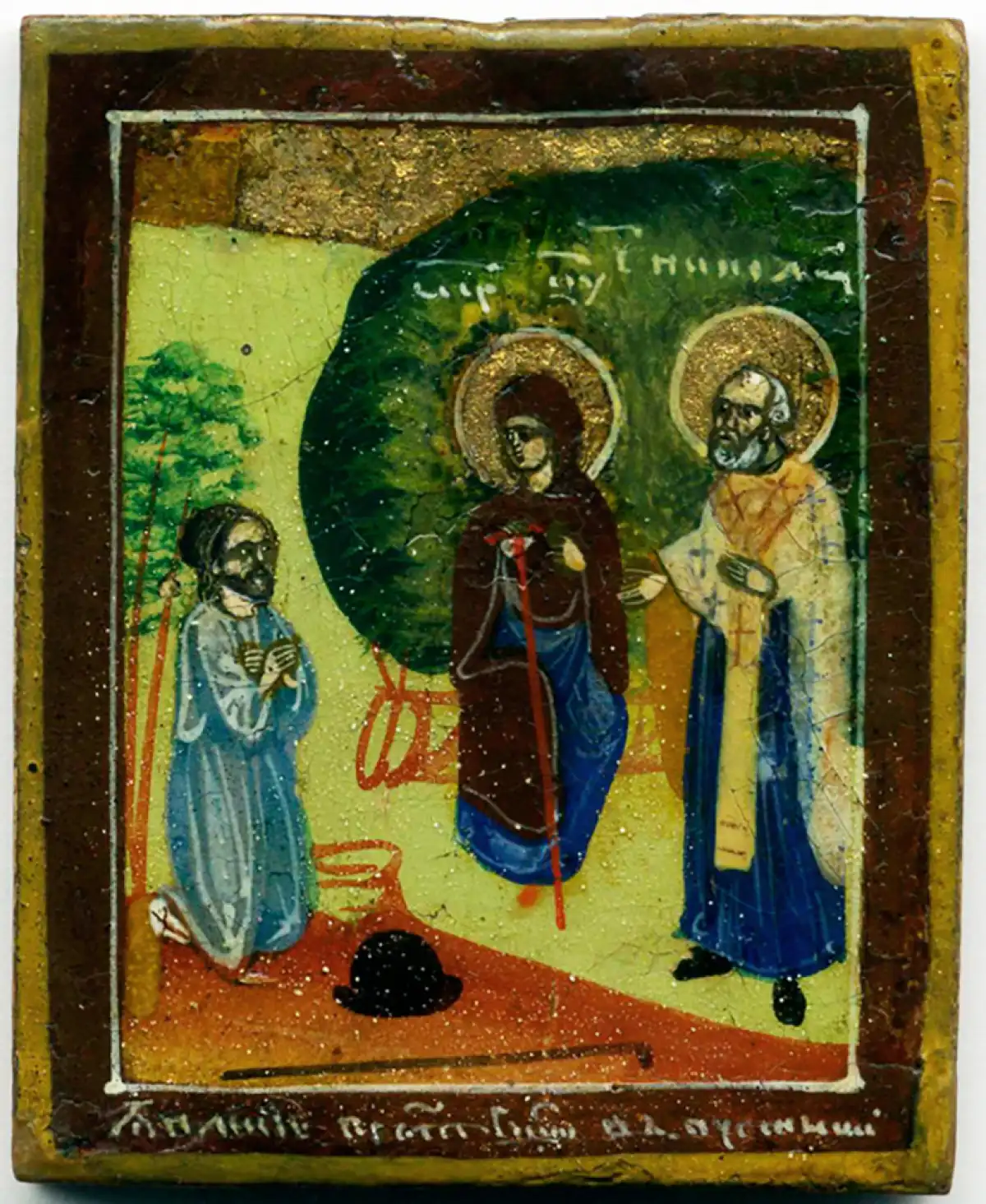 Богоматерь изображена сидящей на корнях дерева с игуменским жезлом в руках; перед ней — коленопреклонённый пономарь, рядом — фигура святителя Николая. История образа уходит в XVI век: в 1515 году по указу великого князя Василия III на месте явления был основан монастырь. В наши дни осталась лишь память об этой обители. Она существует в том числе благодаря таким образкам, хранимым и передаваемым из поколения в поколение.