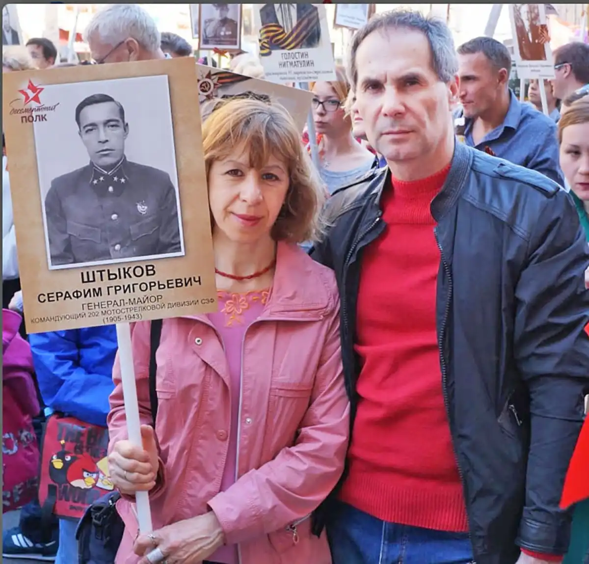 Марина Аббасовна Рагимова-Штыкова — внучка Серафима Григорьевича. Она филолог, преподаёт в Санкт-Петербургской консерватории им. Н.А. Римского-Корсакова. Мы с нею знакомы лишь заочно, при этом я знаю её в лицо. Благодаря коллеге, в прошлом журналисту «НВ», Людмиле Петрищевой. Старая Русса, 9 Мая, «Бессмертный полк». Марина, её супруг Олег Ус и фото генерала Штыкова. Есть журналисты, словно притягивающие сюжет. Ведь это у родных Людмилы Александровны внучка Штыкова сняла жильё.