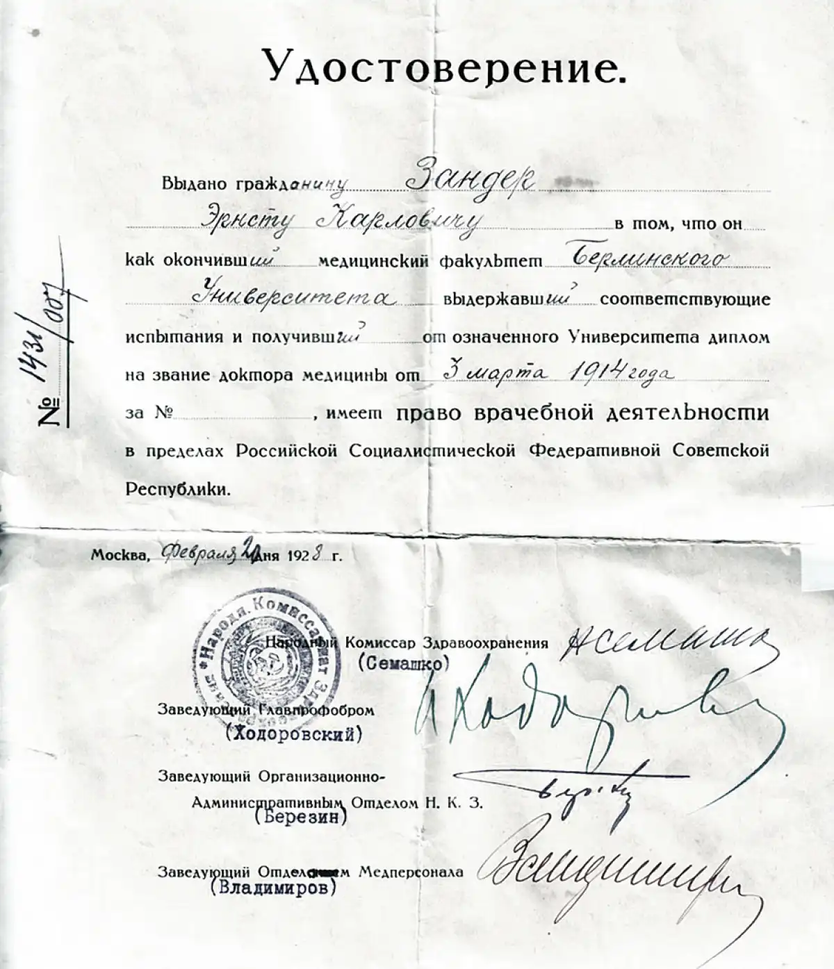 Есть также любопытный документ, выданный Зандеру за подписью наркома здравоохранения Семашко. Тем самым он получал право на врачебную практику в РСФСР. Особое разрешение понадобилось, поскольку диплом доктору был выдан в Берлине.