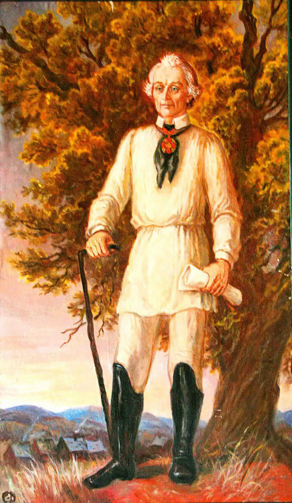 «Я его писала на фоне горы Дубихи. Ростовой портрет. У меня была картина, где Суворов изображён с Екатериной II. А здесь он — другой. В опале, наедине со своими мыслями. Мне изначально хотелось показать его человеком думающим, переживающим и, несмотря ни на что, верящим. Писать было трудно. Ведь на своих портретах Суворов всегда разный. Он не любил позировать, не любил зеркал. Художники писали его по впечатлению, по представлению. Я обложилась этими портретами, но никак не могла понять, где же он настоящий. Несколько раз заново писала лицо. Всё напрасно, тупик! Когда трудно, я молюсь: «Силы Небесные, помогите мне сделать Суворова таким, каким он был». И после этой моей мольбы у меня пошло. Враз».