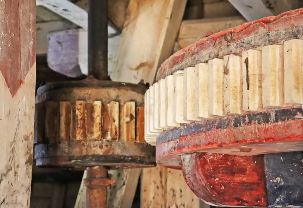 Человеку XXI века разобраться, как работала мельница столетие назад, непросто, но можно. Мельник брался за рычаг, с помощью которого менял положение поворотной шапки так, чтобы можно было поймать крыльями ветер. Тот начинал вращать лопасти, а те передавали движение на горизонтальный вал. Шестерня крутилась и в свою очередь заставляла вращаться вертикальный вал — он пронизывает мельницу насквозь с самого низа до шапки. Кстати, сохранился в полном порядке и в реставрации не нуждается. Эта часть механизма связана с верхним подвижным жерновом, который располагается на втором ярусе.
