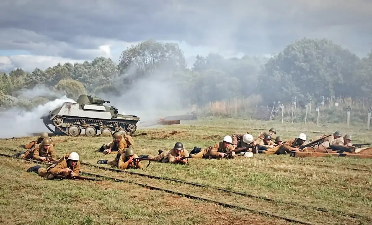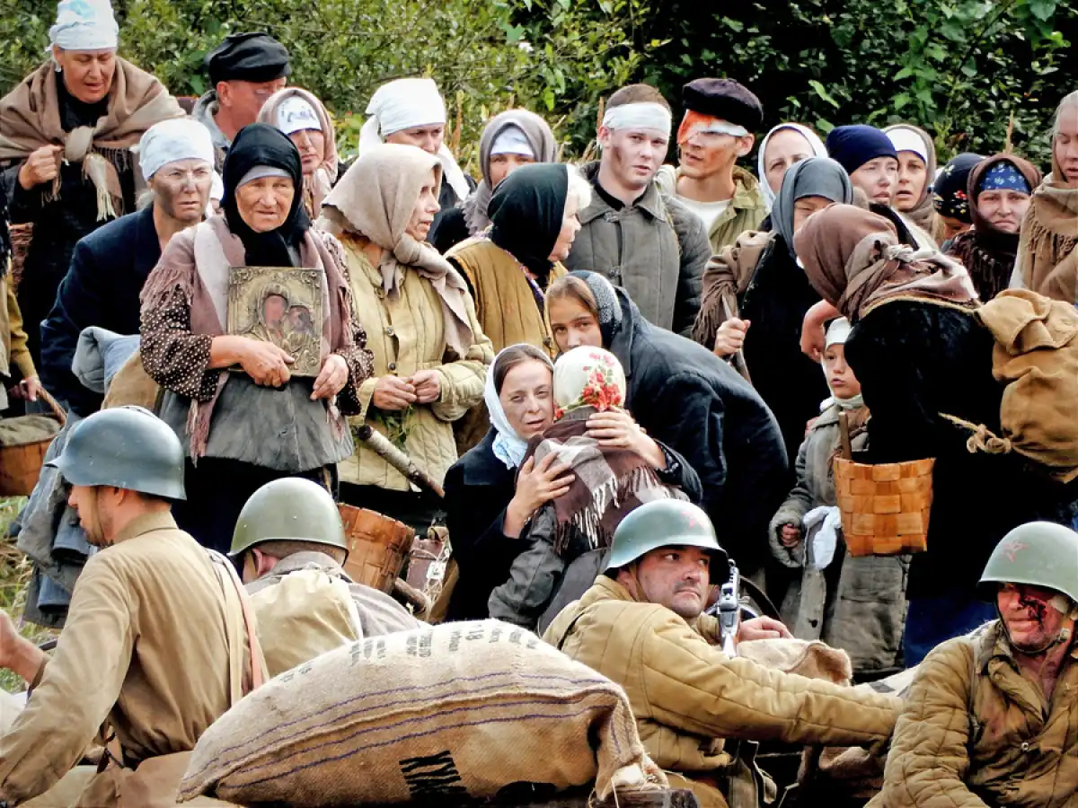 И снова в атаку поднимаются красноармейцы, падают, опять бегут, строчит немецкий пулемёт, разрываются гранаты. Пригибаясь к земле под пулями, к поданному составу бегут местные беженцы — с тюками, иконами, плачущими детьми. И зритель внезапно понимает, что челюсти сжаты, сжаты кулаки, всё тело напряжено и смотреть за происходящим отстранённо, как за спектаклем, просто невозможно. Память предков, может быть?