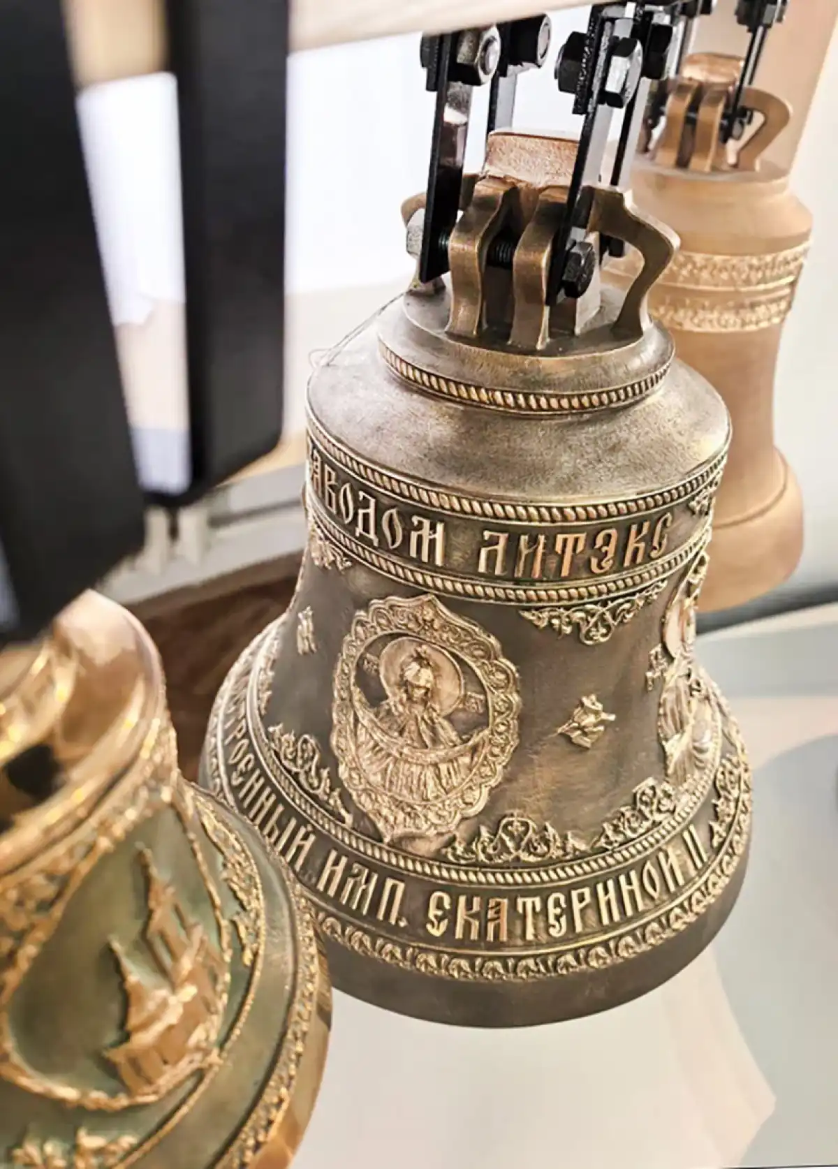 У каждого колокола — своя история. Вот повторение колокола, отлитого к 300-летию дома Романовых. А вот — реплика колокола с первого линейного корабля русского флота, построенного Петром.