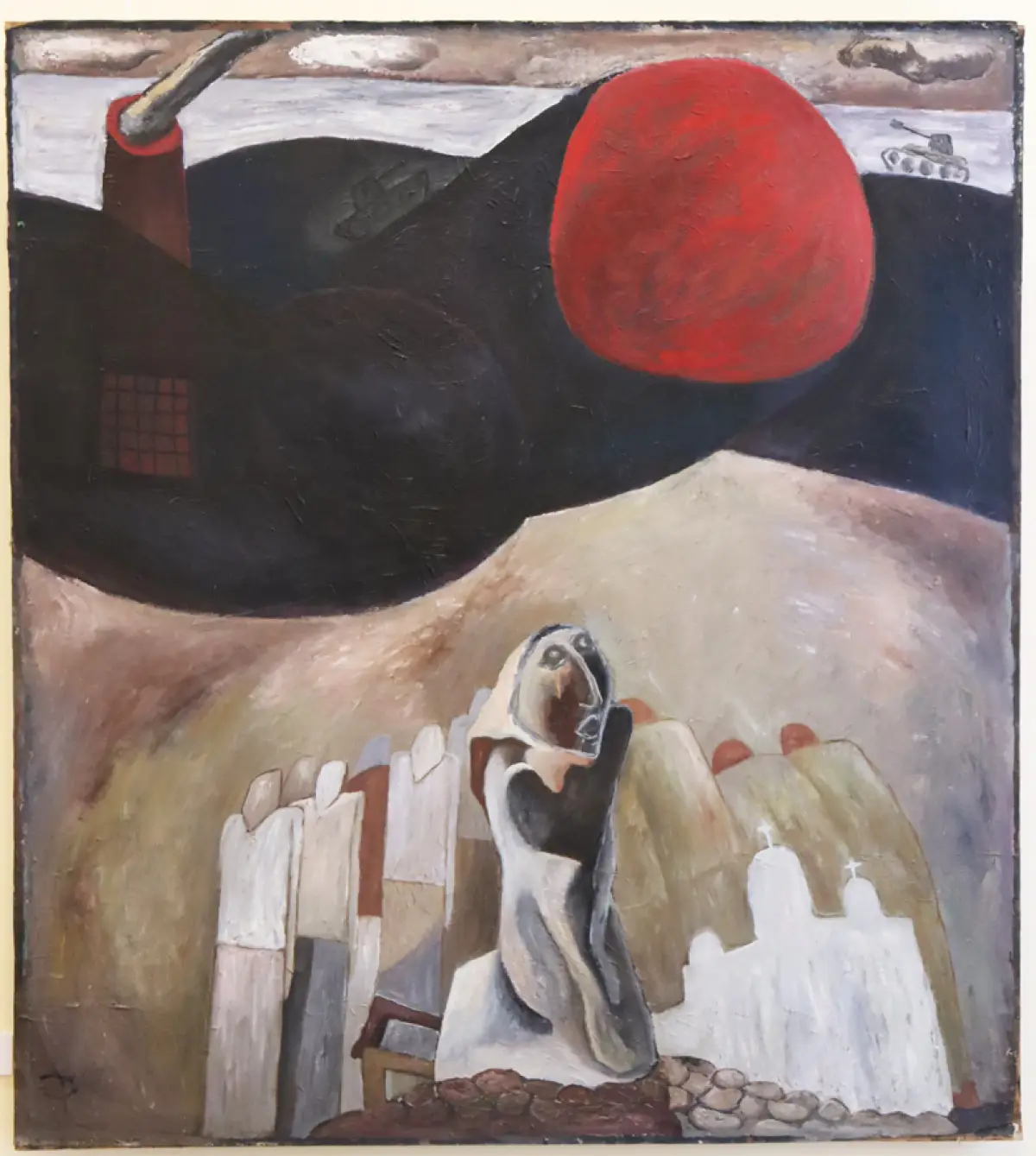 И, кстати, у него есть работы, безусловно, связанные с воспоминаниями о войне. Художник воевал на Севере. И его композиции напоминают суровый этот край — камни, сопки. Обращает на себя внимание, конечно, и «Фронтовой натюрморт» мастера — кружка, котелок, гильзы. Взгляд искусствоведа видит в этой композиции нечто большее — и пятиглавие храма, и Вечный огонь.