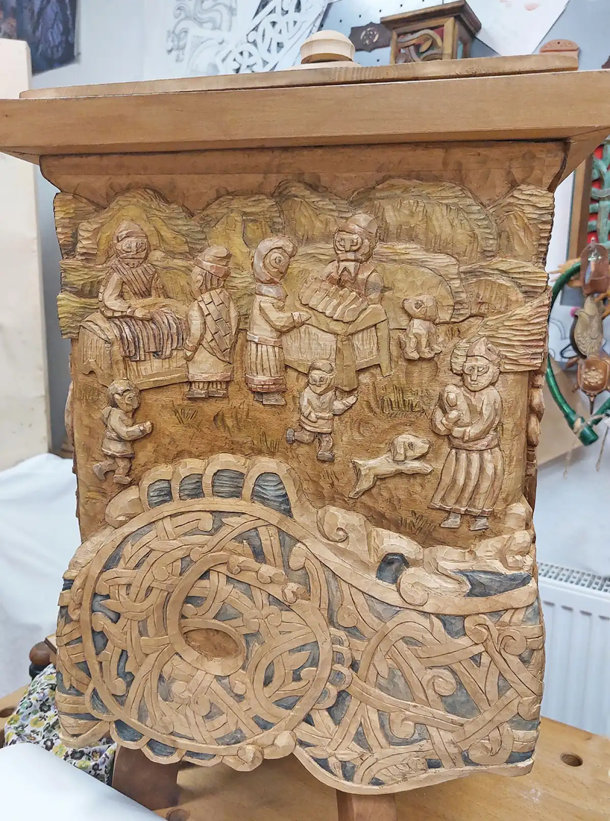 — Вот посмотрите, — Фёдор Рольфович для начала раскрывает фолиант об искусстве Древнего Новгорода и показывает на иллюстрацию с фотографией костяной пластики ХIII века, на которой вырезан дракон, а потом указывает на панно, что висит на стене. В нём это мифическое животное уже заключено в рельеф «плетёнки». — Работу выполнила наша замечательная Катюша. Потом появилась ещё одна замечательная ученица, которая вырезала уже объёмную скульптуру дракона, применяя выведенные ранее принципы формообразования. Но её образ дракона навеян анимацией Миядзаки. Моя задача — чтобы в резьбе традиционное формообразование сочеталось с тем, что сейчас в тренде. Тогда будет развитие. Нам остаётся только переработать, пересказать, но нужно сделать это талантливо.