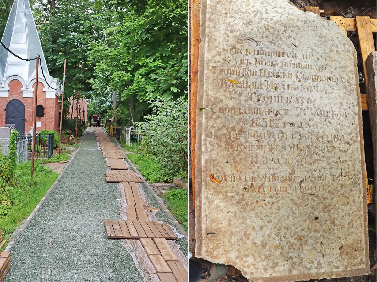 И вот наш музей-заповедник выдаёт новость о том, что его сотрудники «спасают от уничтожения могильные плиты одного из древнейших кладбищ Великого Новгорода». Оказывается, чтобы случилась такая перемена, достаточно было пройтись по дорожке губернатору (теперь уже бывшему) Андрею Никитину и генеральному директору музея Сергею Брюну. На особенность кладбищенского мощения они обратили внимание сразу. Это было пару лет назад, когда начиналась красивая история долгожданной реставрации памятника XII века.