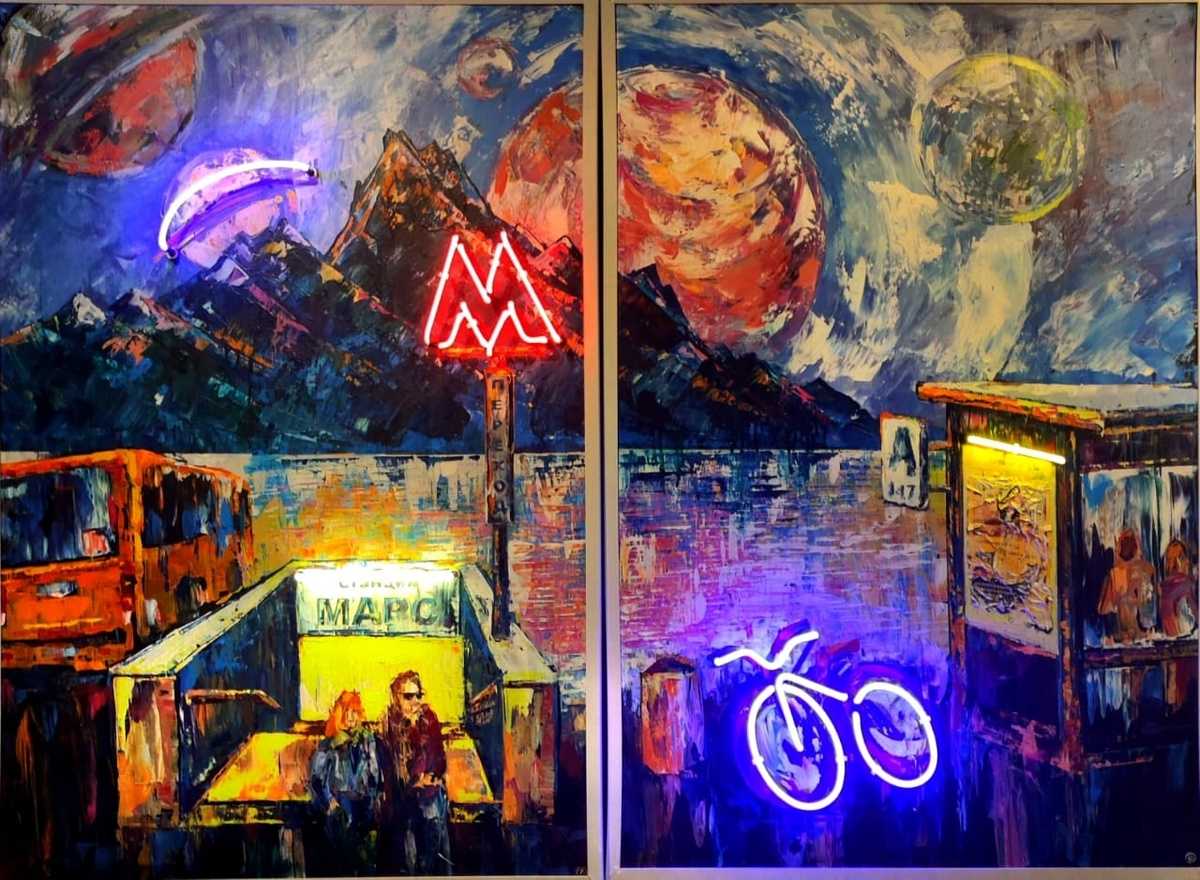 Художница работает в разных жанрах, а новгородцам привезла работы, в которых сочетается масляная и акриловая живопись и свечение неона. Такая техника уникальна, аналогов в России нет. В других странах лишь несколько мастеров включают в композицию живописных картин стеклянный газосветный классический неон.