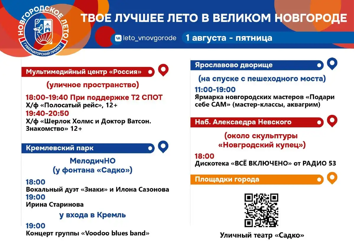 Сегодня, 1 августа, в Великом Новгороде стартуют очередные выходные уличного фестиваля «Новгородское лето». Его гостей ждёт кино под открытым небом, танцы, мультфильмы, живая музыка, лекции, мастер-классы и концерты.