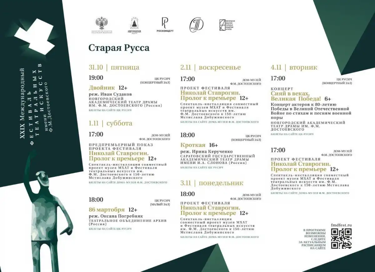 Сегодня, 31 октября, в Великом Новгороде и Старой Руссе начинает работать XXIX Международный фестиваль театральных искусств имени Достоевского.
