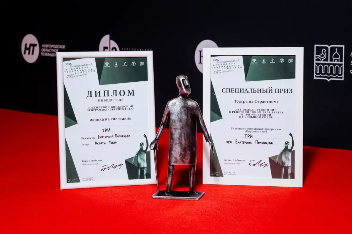 Победителем конкурсной программы «Перспектива» стал эскиз спектакля «Три». Режиссёр Екатерина Половцева получит денежный грант на полноценную реализацию проекта и покажет его на Международном фестивале театральных искусств имени Достоевского в следующем году. Коллектив ждёт ещё один приятный сюрприз – партнёр фестиваля, Театр на Страстном, на две недели предоставит возможность работать в своем репетиционном зале, а три генеральных репетиции провести на основной сцене.