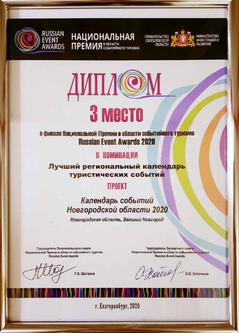 Проект «Календарь событий Новгородской области-2020» занял третье место в финале национальной премии в сфере событийного туризма Russian Event Awards. Церемония награждения прошла 10 декабря в Екатеринбурге.