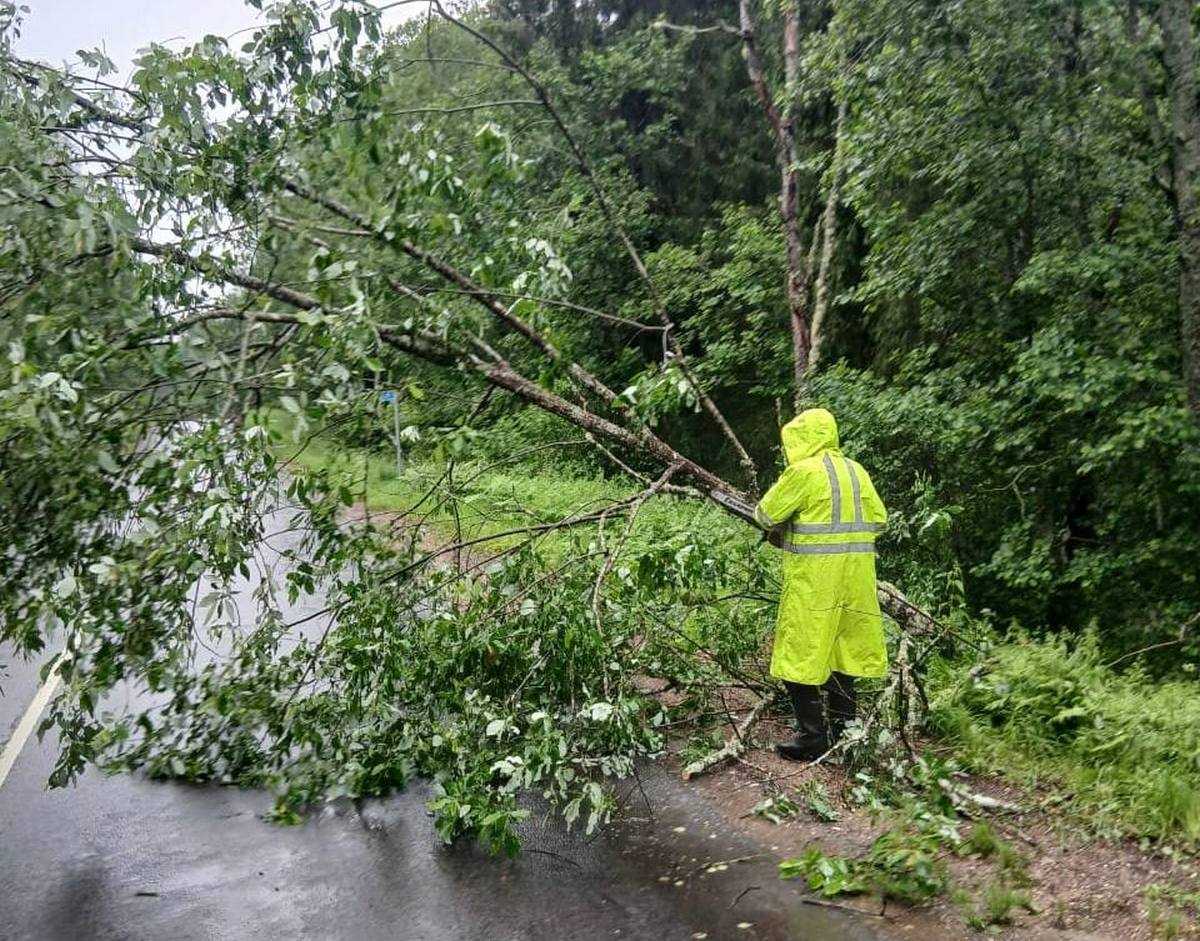 После дождя с порывистым ветром дорожники убирают с проезжей части поваленные ветром деревья, сообщили в министерстве транспорта и дорожного хозяйства региона.