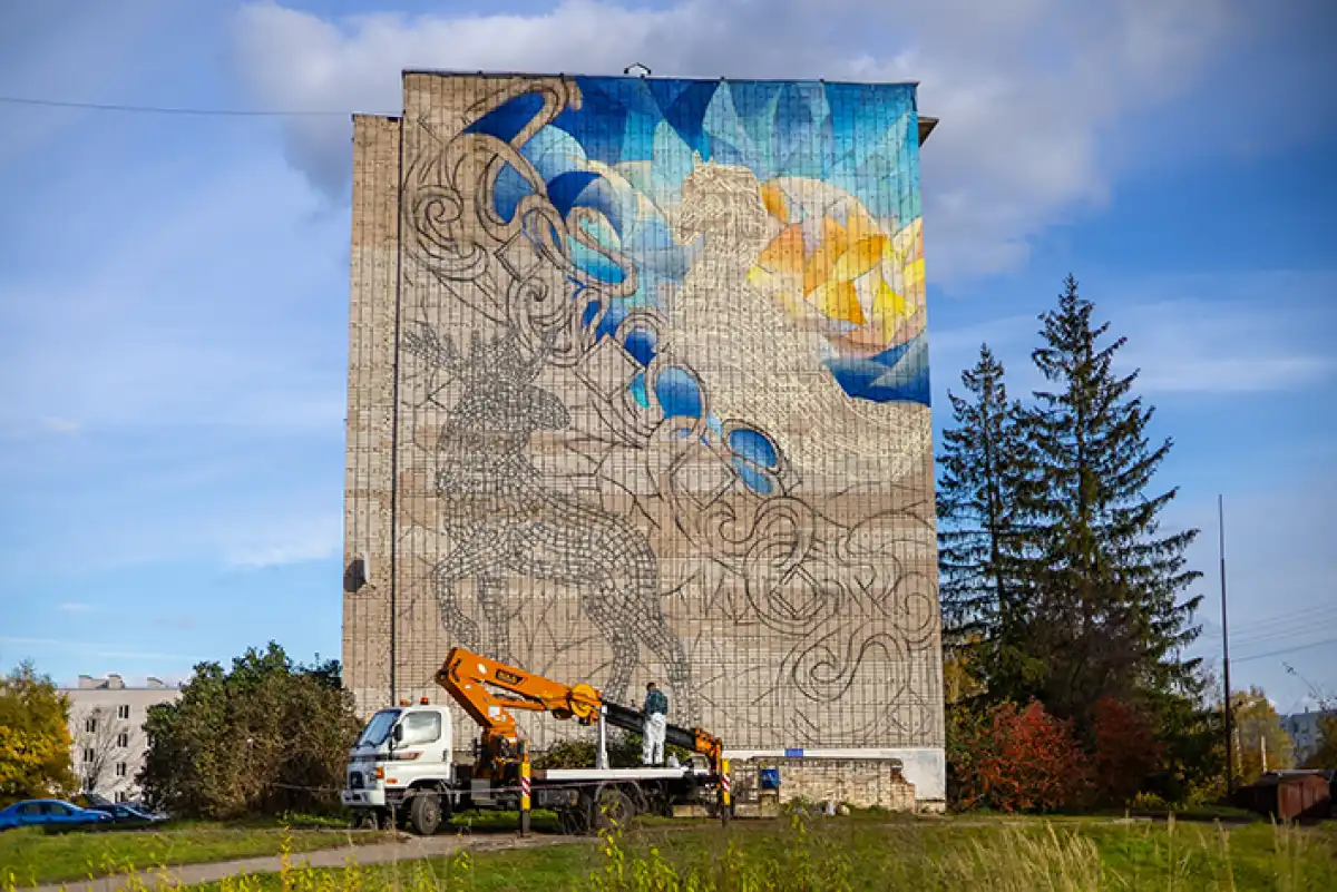 Обычный фасад в посёлке Парфино преображается на глазах: здесь появляется первый в истории округа мурал