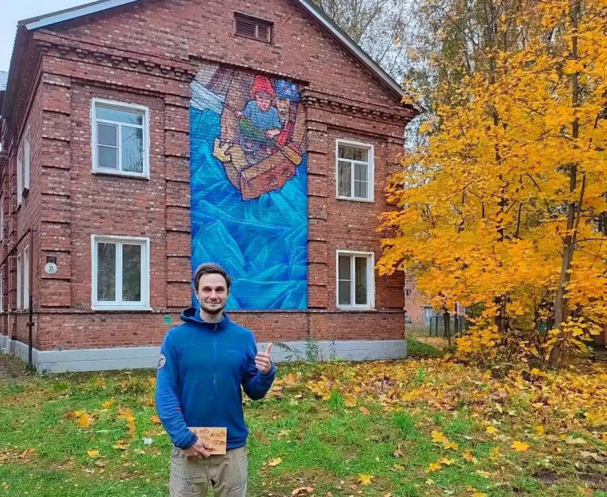 Это не первая работа Кузнецова в регионе. В прошлом году он создал мурал с велосипедистом на торце дома в Старой Руссе.