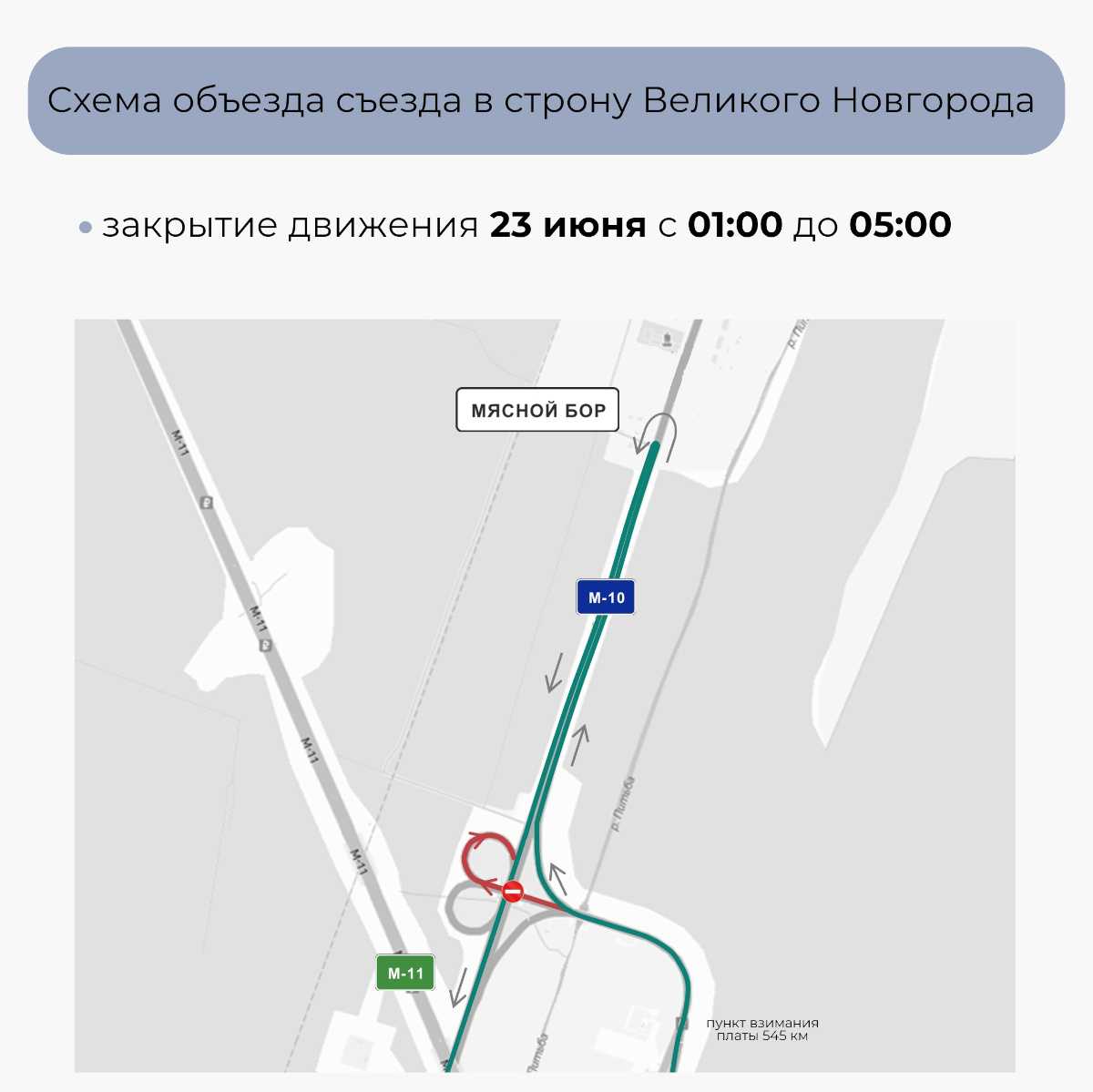 Объезд предусмотрен по съезду в сторону деревни Мясной Бор с последующим разворотом.