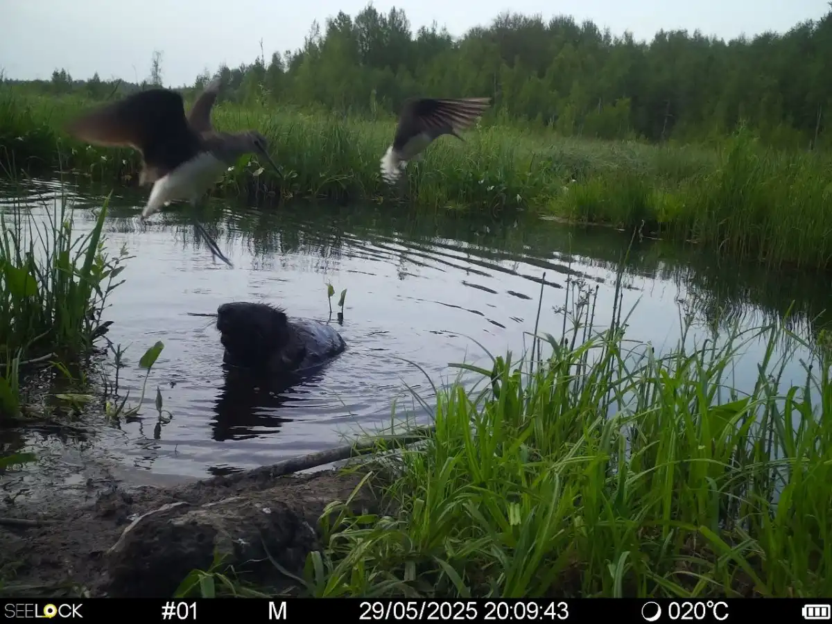 29 мая фотоловушка зафиксировала любопытные кадры встречи бобра с чернышами. В это день в кадр попадали одновременно до пяти птиц, но на фоне бобра удалось сфотографироваться только двоим чернышам.