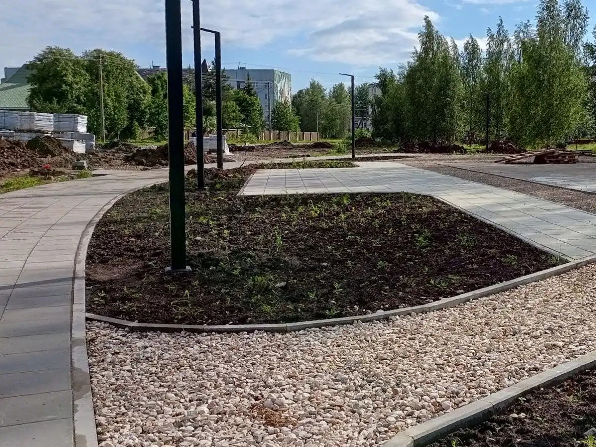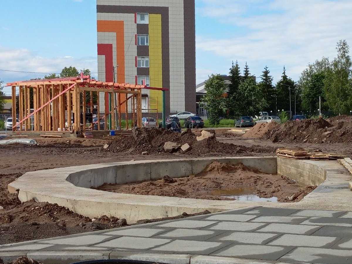 Сейчас на территории прокладывают пешеходные дорожки, проводят планировку растительного слоя под посев газона, строят фундаменты под композицию из арок и теннисного стола, монтируют системы водоснабжения и водоотведения, прокладывают электросети и сети видеонаблюдения. Одновременно на площадке идёт установка павильона и фонтана.