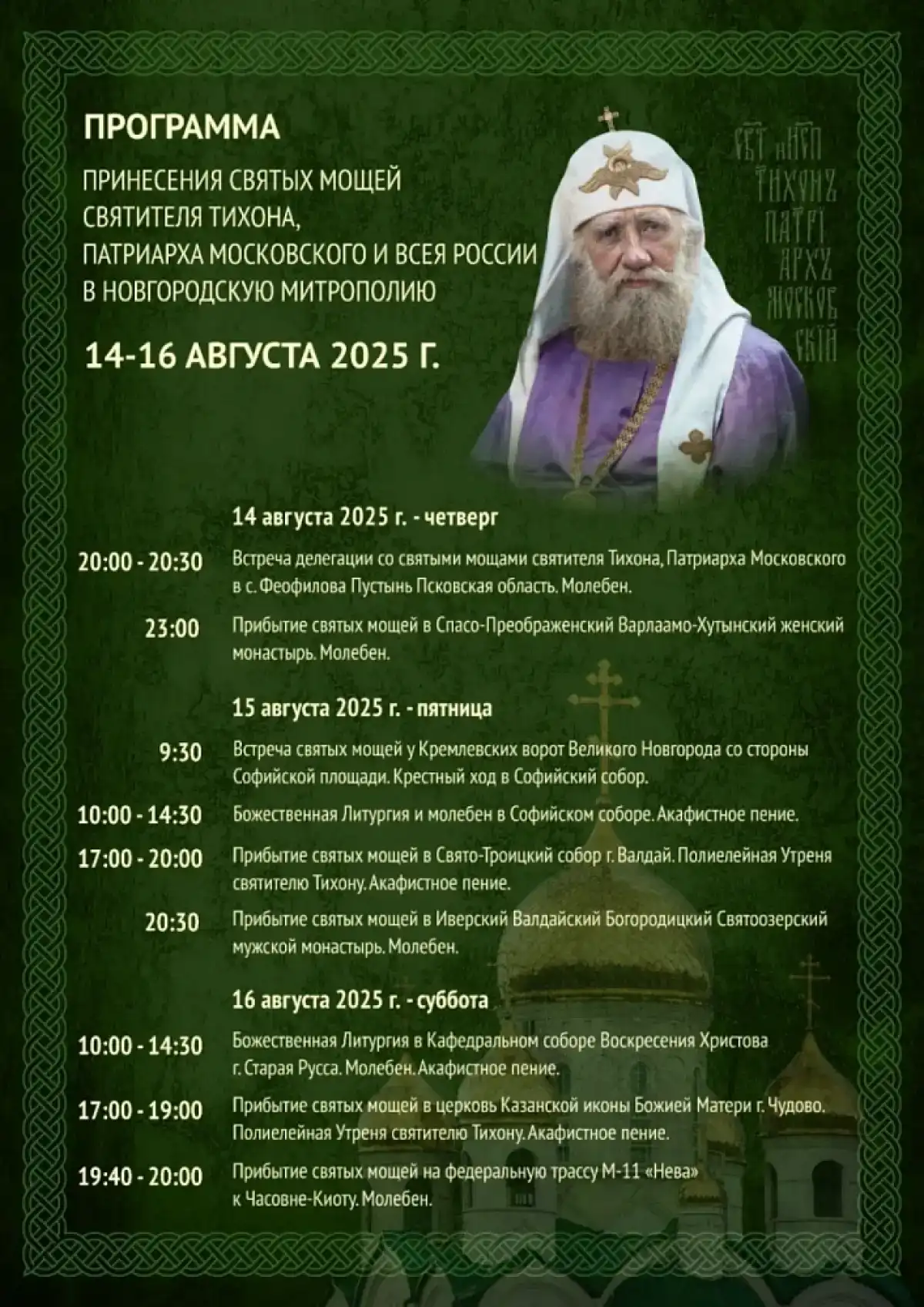 С 14 по 16 августа в Новгородской области будут находиться мощи святителя Тихона, патриарха Московского и всея России.