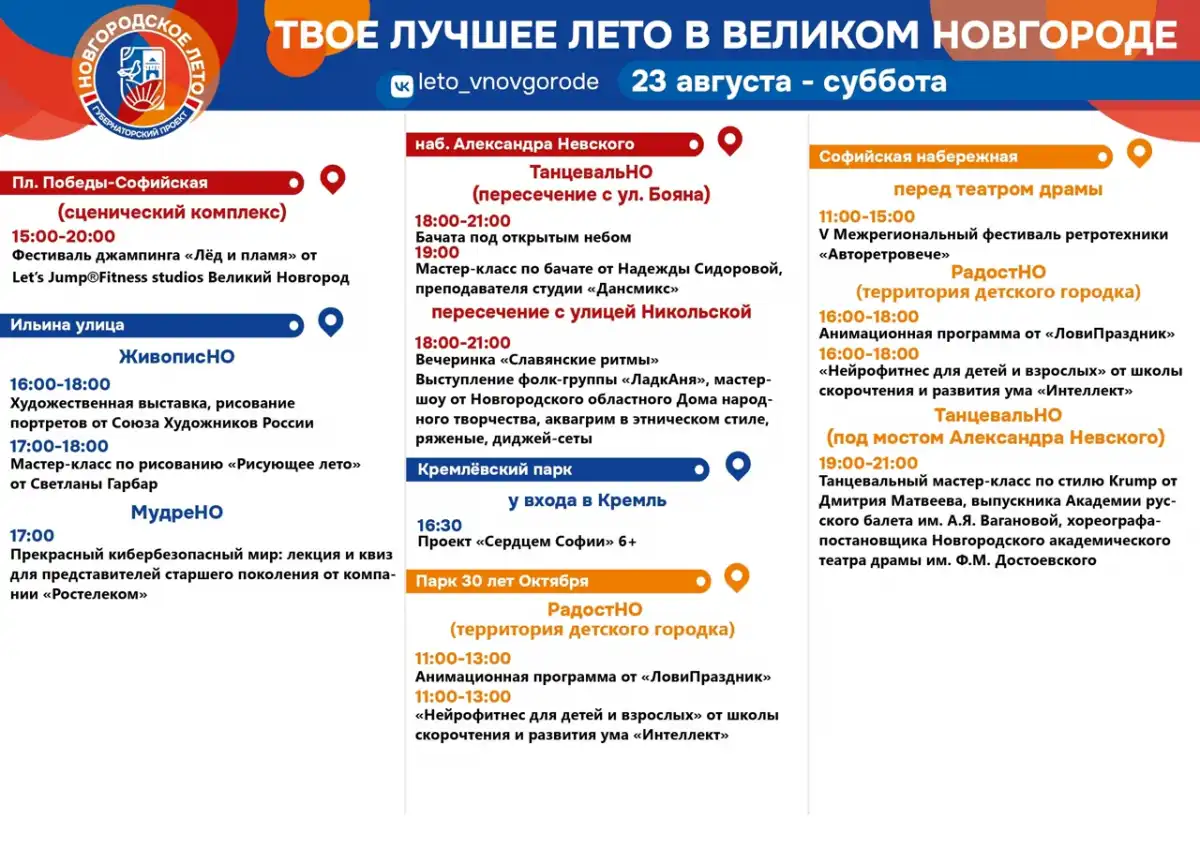 Как и во все минувшие выходные жителей и гостей города ждёт разнообразная культурная, спортивная, досуговая программа на лучших площадках Великого Новгорода.